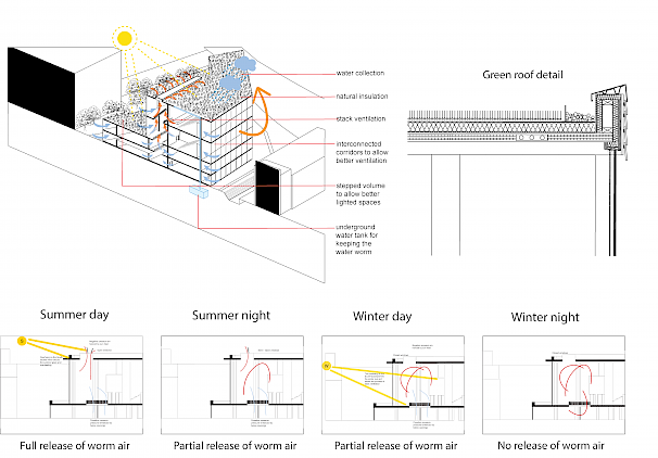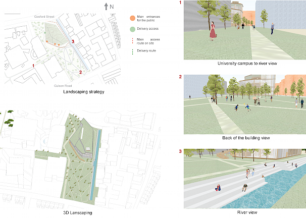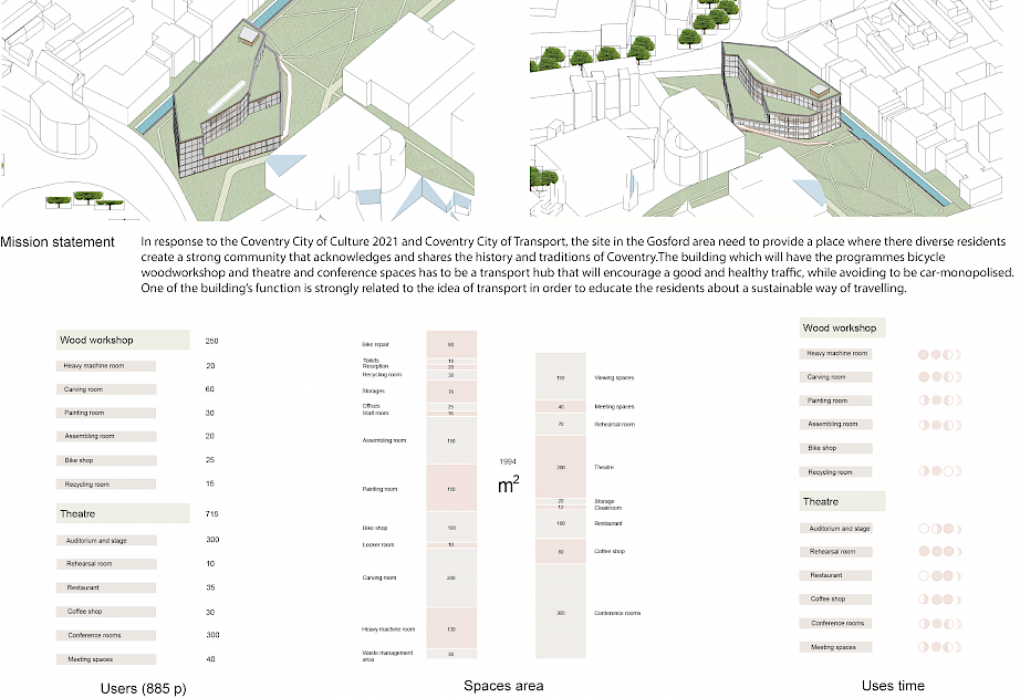 About the project: The site is situated along the river Sherbourne which is known for its woodcarving history that inspired the project. The building has the double function of a wood workshop and modern theatre and it has the role of reconnecting the people with the local heritage and bonding the international community that populates the site. On the other hand, the project focuses on introducing the people to an eco mean of travel and supports local crafts, while it has alternative commercial and leisure uses that contribute to the cultural development of the city.