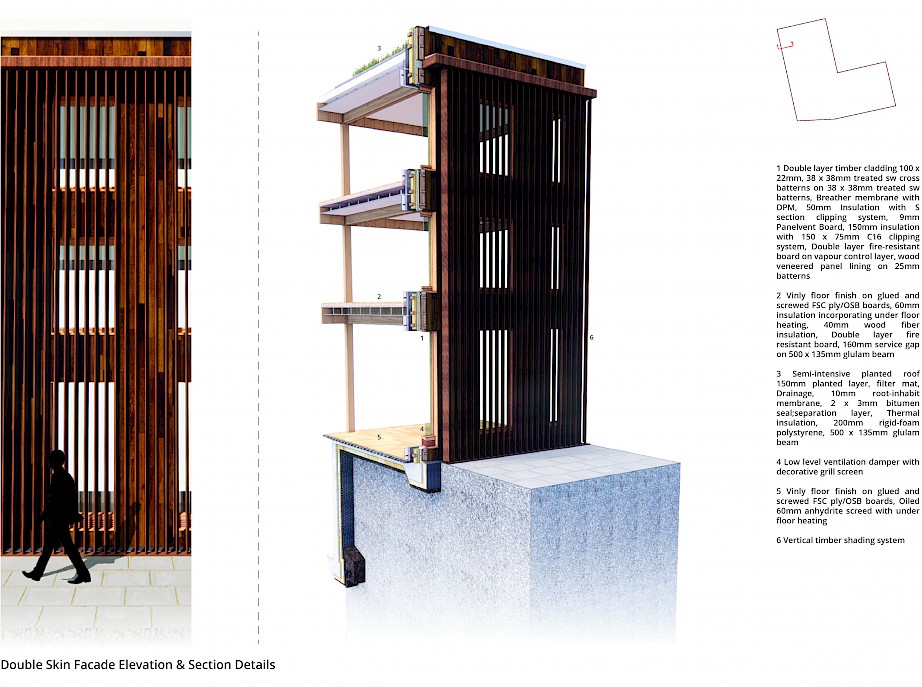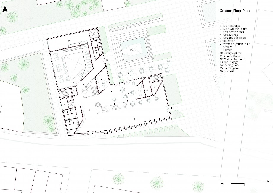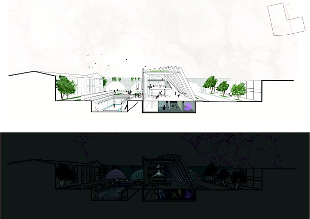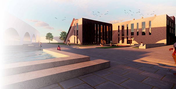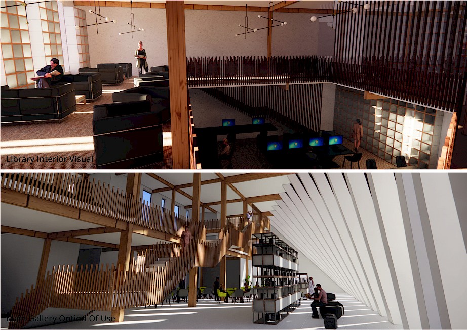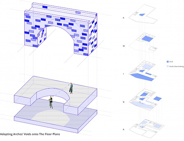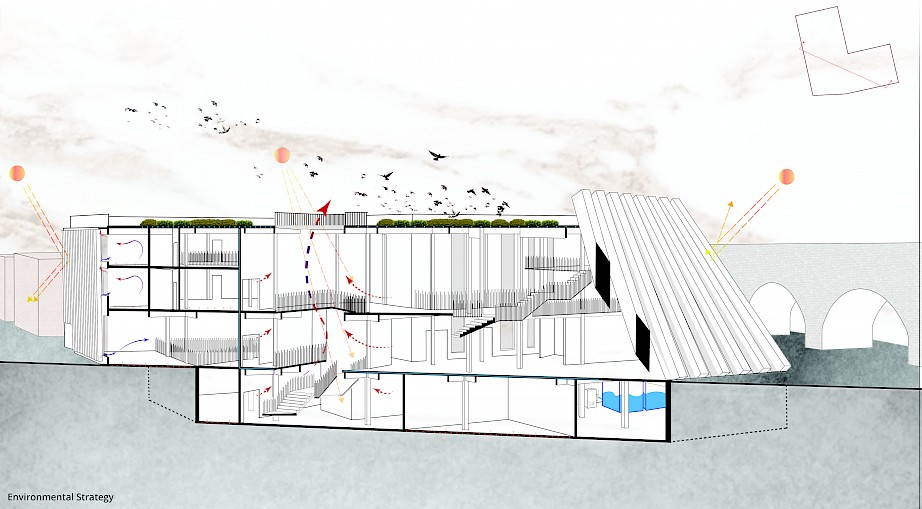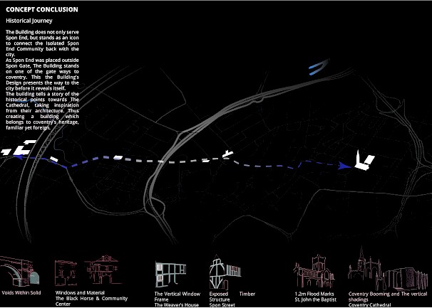 The proposed project is in Spon End, which is a gateway to Coventry. Spon End was placed outside the city walls and eventually grew isolated from the city by the Ring Road and the Railway Arches. Thus, the proposed design aims to tie back the city together and draw inspiration from the railway arches to establish a landmark. Moreover, the main façade represents the contrast between the collapsed Cathedral and the survival of Spon End. The main façade has "fallen" towards the Cathedral and stands strong towards Spon End. In addition, the arches reveal marks of collapse.