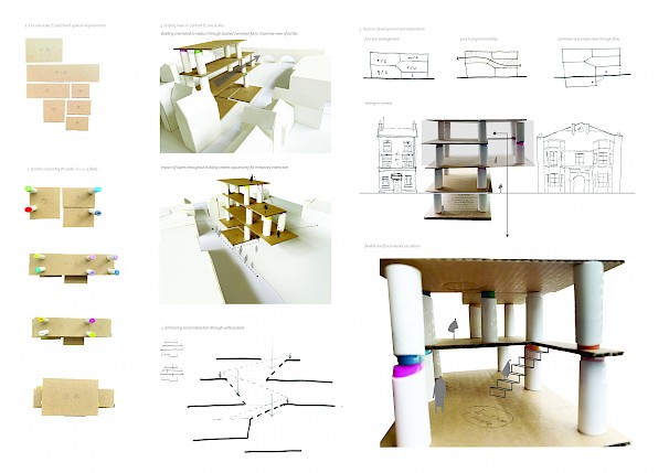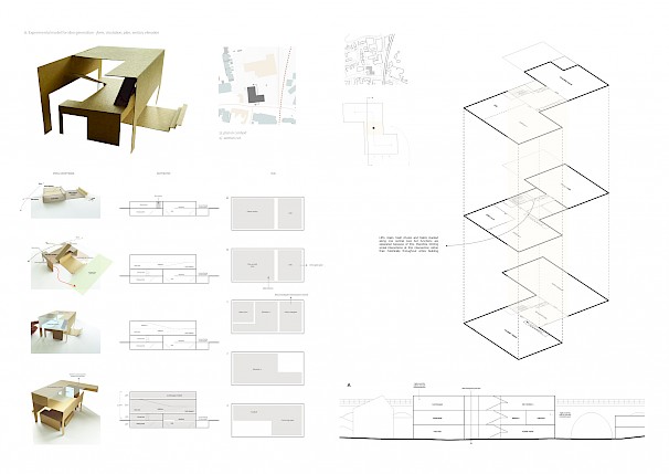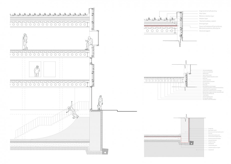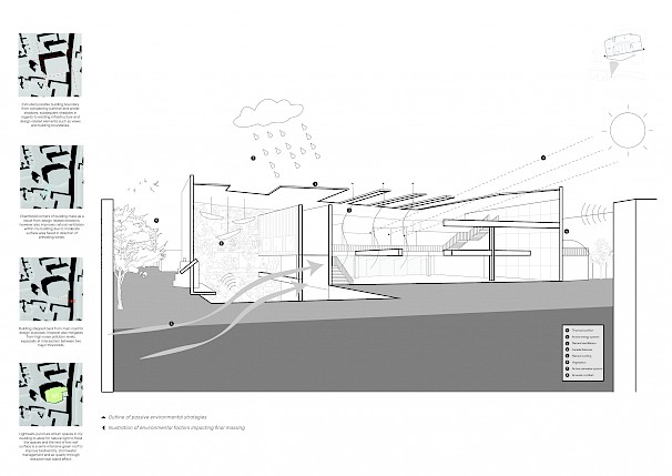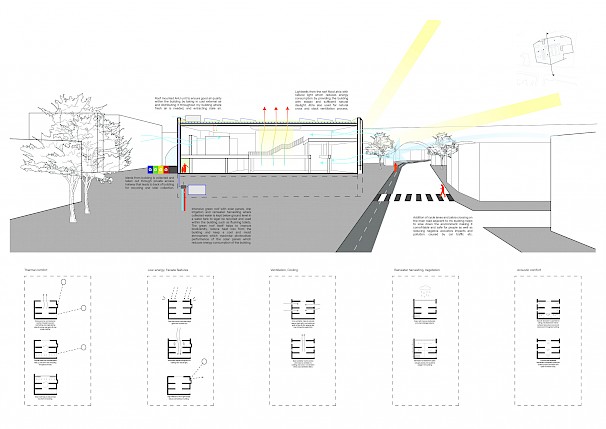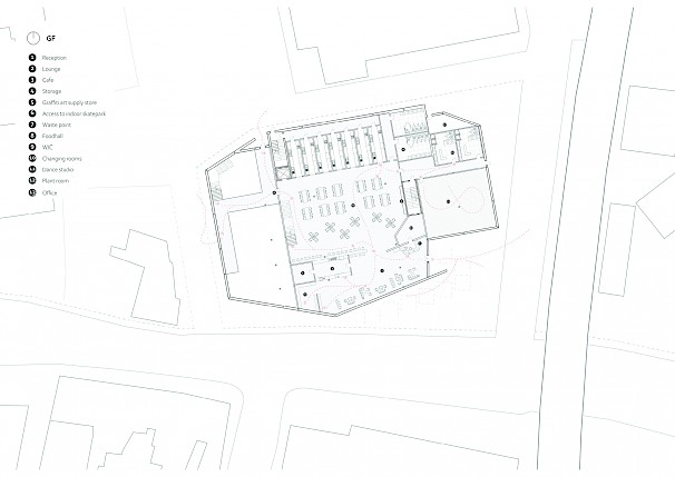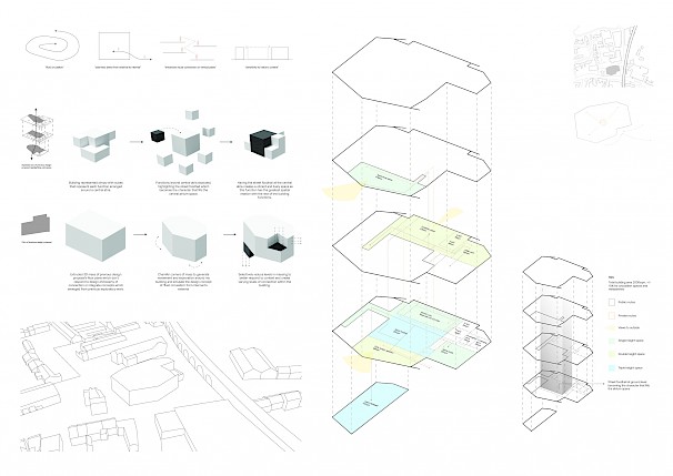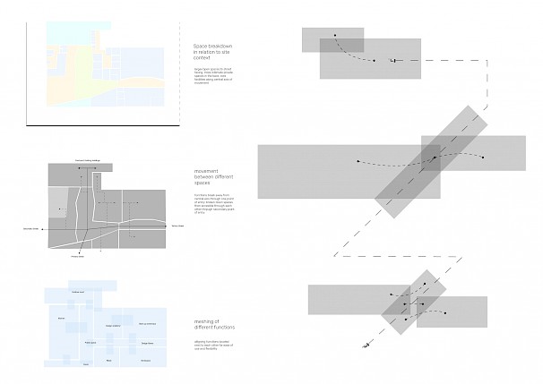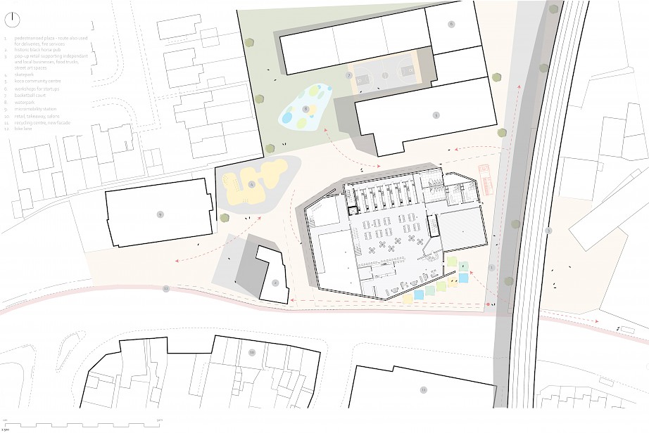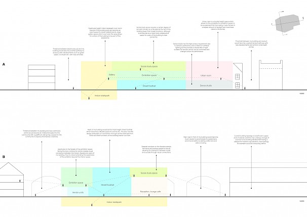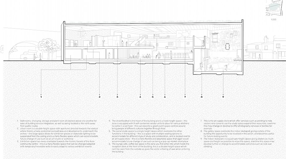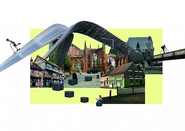 About my project: Dissected from a series of major thresholds, Spon End, much like other areas beyond the Coventry ring road, suffer from socio-economic inactivity due to businesses and developments being concentrated in the city centre. This project aims to draw attention to this issue by creating an 'urban hub typology' which can be replicated in other inactive areas. As well as being designed in response to the City of Culture 2021 event, the building's main aim is to unite the local community and strengthen its connection to central Coventry. The street food hall, urban room and exhibition spaces invite the creative and curious, whilst the indoor skatepark encourages increased connectivity and movement from the city centre by promoting micro-mobility as a fun, active, and sustainable form of transportation.