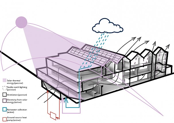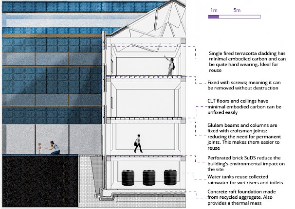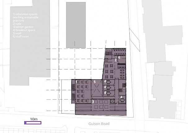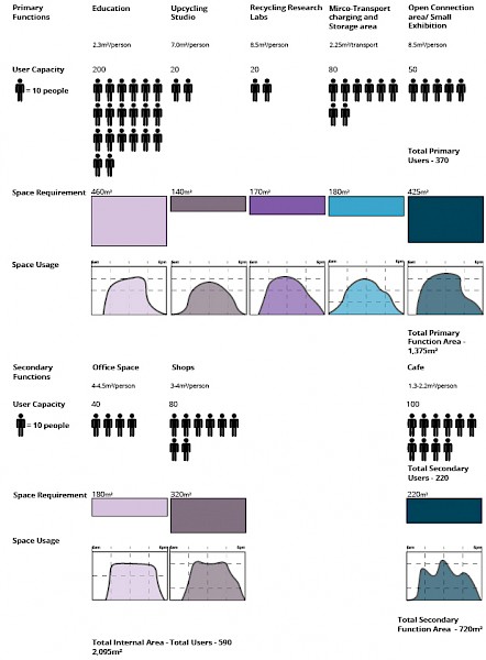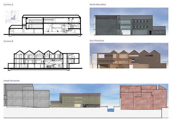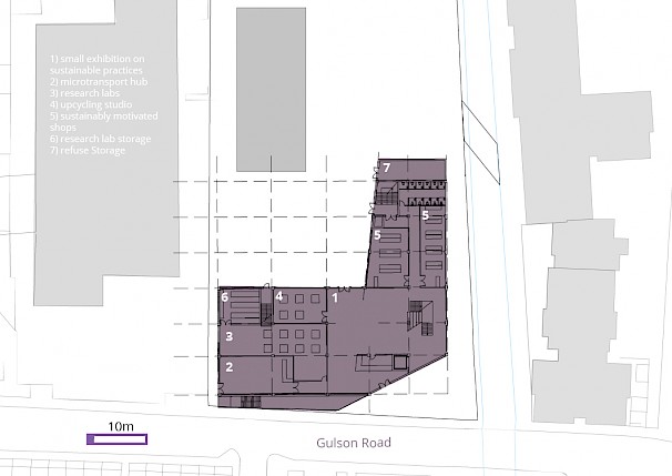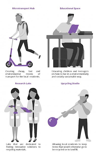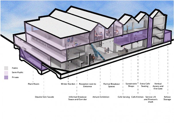 About the project: Situated at the barrier between Coventry's large and fine grain typologies, the SustainCentre aims to connect people in multiple ways; to their City, to their environment and to each other. Thus, making them more aware of the place they live, how to improve it, and give people a stake in their community. The SustainCentre's functions can be split into the three well known categories of reduce, reuse and recycle. These categories manifest in multiple ways, with the aim to connect the users to these debates. At the forefront of this project is a micro-transport hub allowing users to commute efficiently, economically and environmentally.