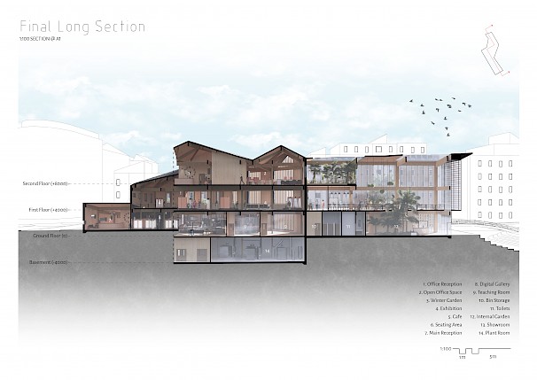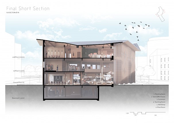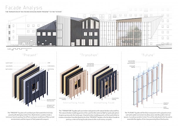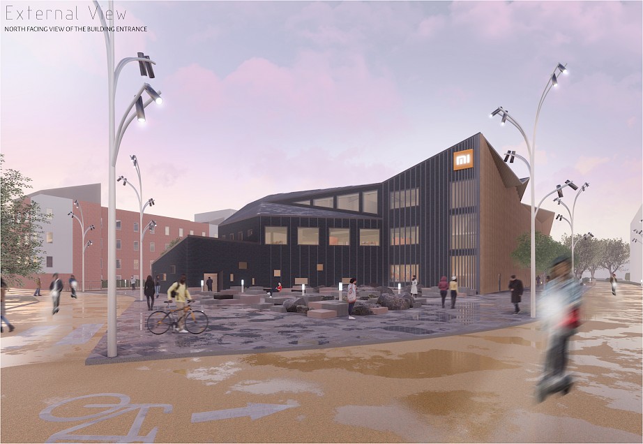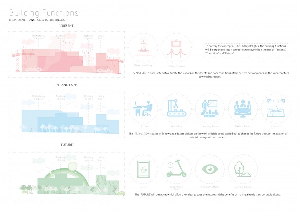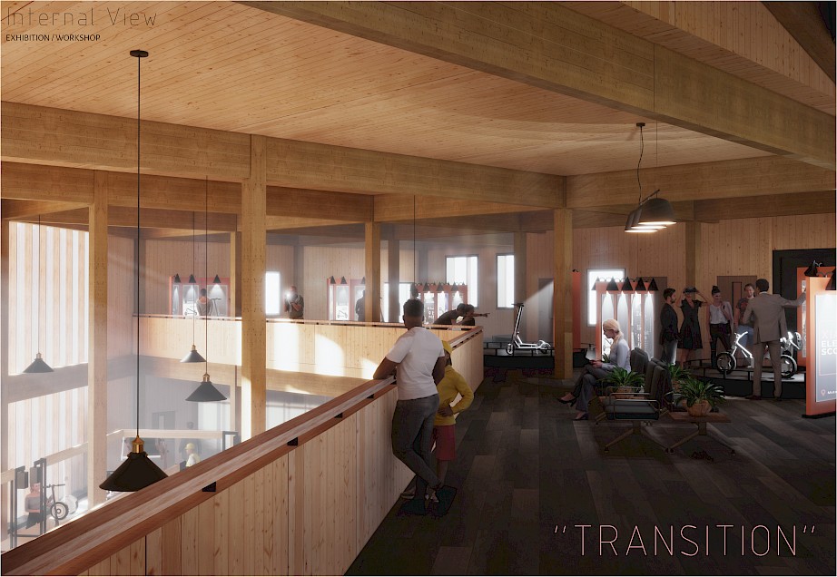 Coventry has a wide history and heritage in transport. Today, however, the City has become very car-dominated resulting in issues such as carbon emissions and pollution. The project aims to draw attention to the problem of fuel-powered vehicles, and promote a more sustainable means of transportation using electric micro-mobility. The programme includes a multifunctional semi-public building that operates as both a functional research centre and a museum to encourage visitors to switch to electrical transport. A concept of the past to the future is portrayed in the spatial layout of the building. This reflects the transition from the "present" environmental issues in Coventry, taking visitors on a 'journey' through a "transition" into a sustainable and more environmentally friendly "future" of transport.