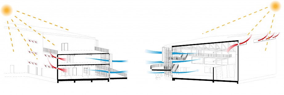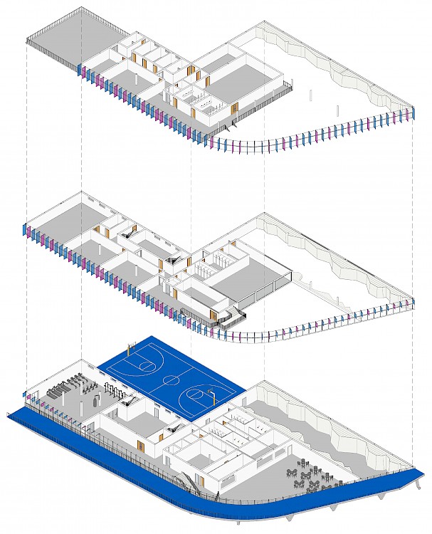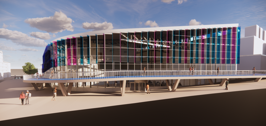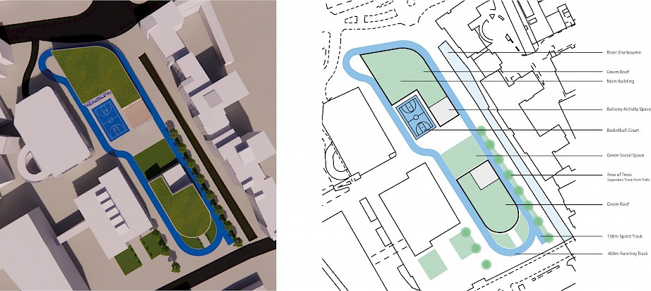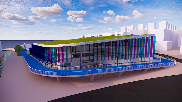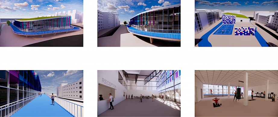 The exterior of the building has been designed around the blue and pink colouration of the Sport Coventry logo. This includes development of an exterior 400 metre running track that is elevated to form an entrance to the building. The interior of the design provides a variety of spaces for all potential users, including a climbing and bouldering wall, strength and conditioning area, activity space, sports injury/ rehabilitation area, teaching rooms and more.