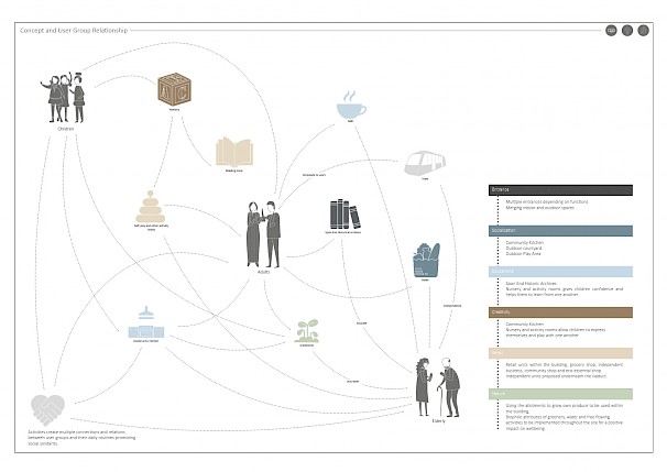 Spon End House was designed to represent community involvement and how important that can be in shaping future generations. The focus of the project was to retain historical attributes of the site whilst creating a space which would allow those living in the community to be apart of a direct support system - whether that be childcare, transportation, retail, education or living a healthy lifestyle. Continuation of spaces and activities drove this project forward, emphasising the importance of interactions with nature and surroundings. This can be seen within the façades chosen whereby the south façade shares characteristics of existing buildings and the north, east and west façades are influenced by internal activities. Spon End House is a multigenerational inclusive building with a central courtyard that can grow and adapt with its user group's needs.