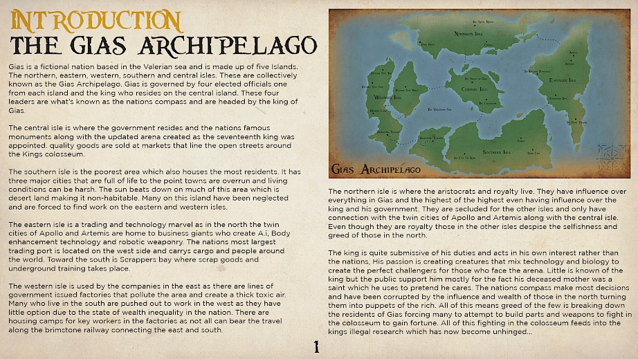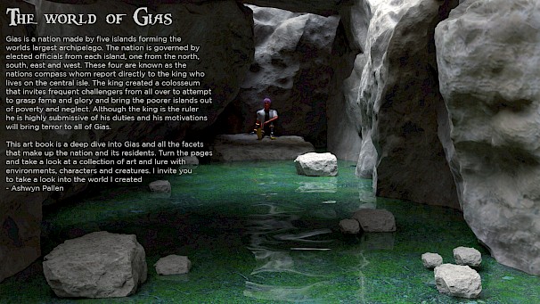 Hi! I'm Ashwyn Pallen and I'm a 3d concept artist who is passionate about storytelling. Creating art around worlds, characters and settings is what I enjoy to do the most. I wish to adapt my work to the film and TV show industry by visualizing the stories through 3d concept art. For my project I have created a concept art book based around a world that I have created. This book is called 'The world of Gias' and it explores environments, structures, characters and creatures that all reside in the world's largest archipelago known as Gias. This project displays my passions for telling stories within my art. The way Disney and Pixar convey stories and emotion through their art is something that inspires me to make viewers feel sad, happy, afraid and excited. I create 3d imagery mainly within blender as I believe this is the future of 3d production programs. Inspiring others and giving them a release through art and media is a goal that I wish to achieve as a professional 3d concept artist. I hope to one day create a production around my ideas and art as creating my passion project is what motivates me to improve!
