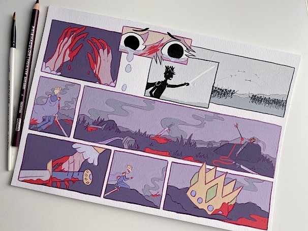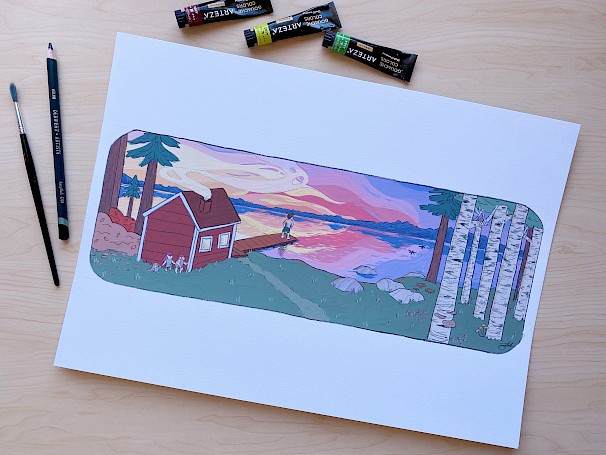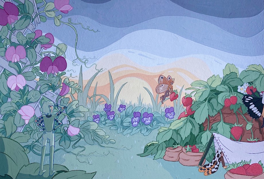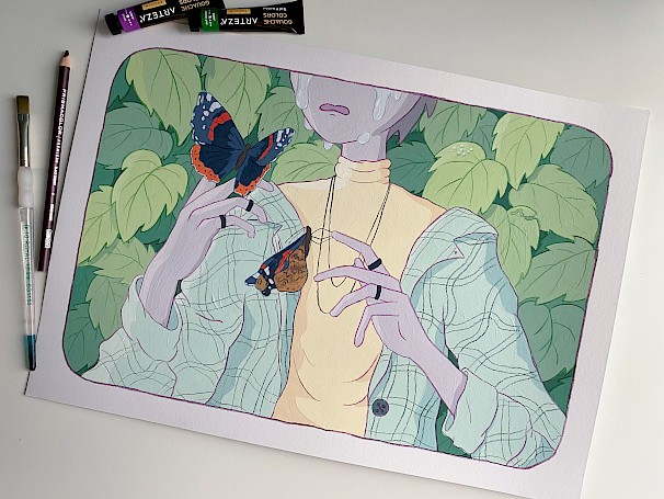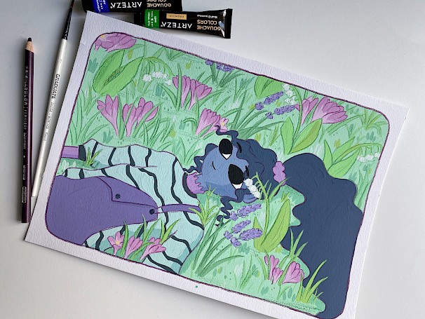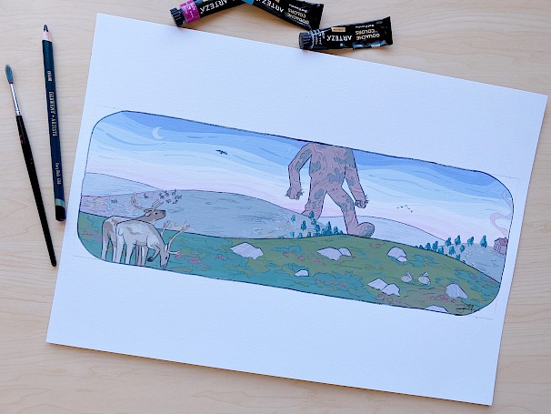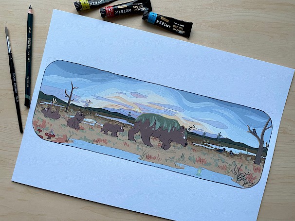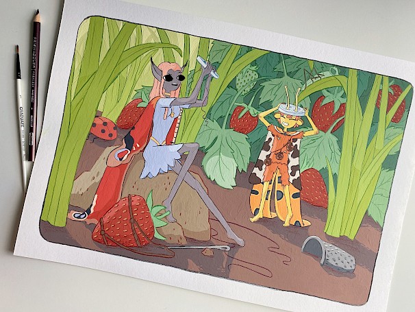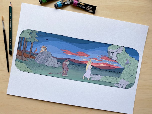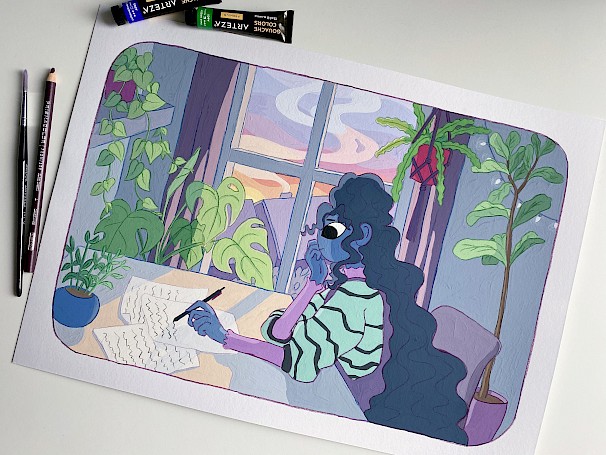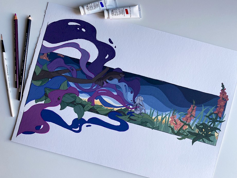 I am a concept artist whose work is greatly inspired by contemporary animated tv, such as Steven Universe, Hilda, and Adventure Time. Depression and anxiety have been consistent themes throughout my practice; much like the animations that inspire me I like to tell layered stories with a whimsical, bright, and colourful style. Working with gouache and coloured pencil helps me bring a bold, digital style into the real world.