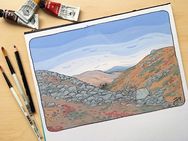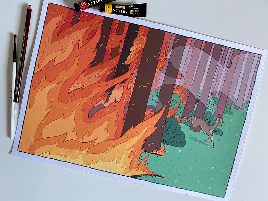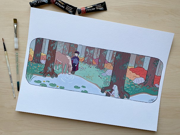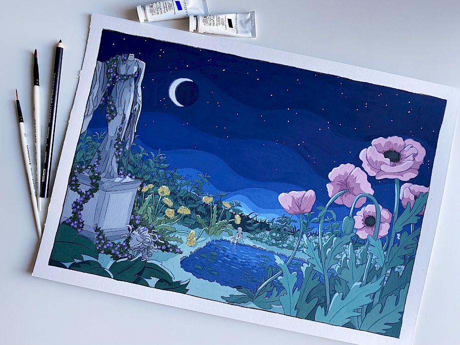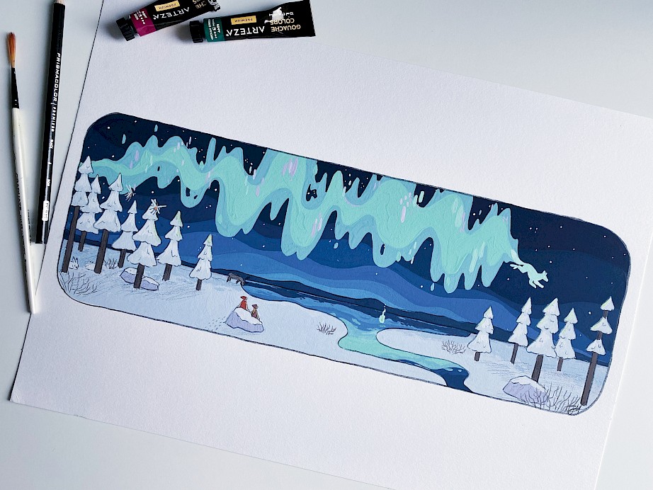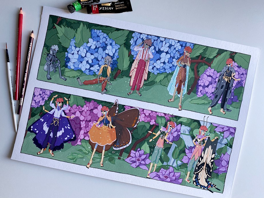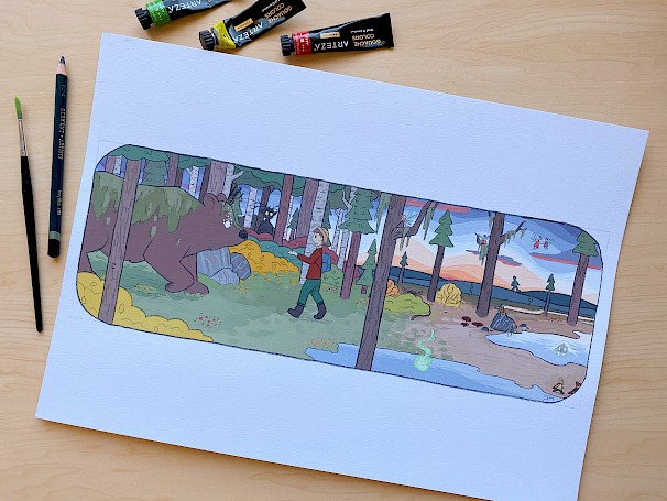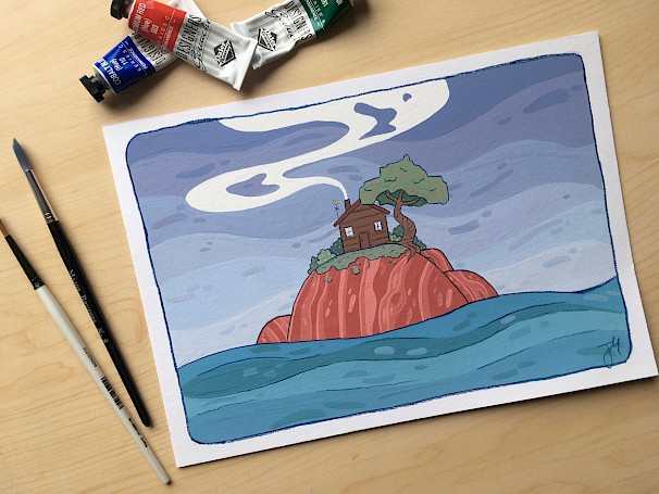 I am a concept artist whose work is greatly inspired by contemporary animated tv, such as Steven Universe, Hilda, and Adventure Time. Depression and anxiety have been consistent themes throughout my practice; much like the animations that inspire me I like to tell layered stories with a whimsical, bright, and colourful style. Working with gouache and coloured pencil helps me bring a bold, digital style into the real world.