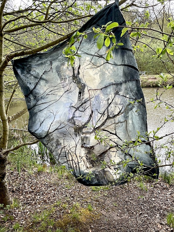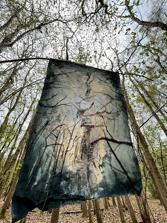 Over regular intervals I drew 25 images in the woods using a black ink pen, and then painted in the studio from these drawings. My final piece consists of an amalgamation of drawings with photographs of the woods I had previously taken. I used acrylic paint, black Indian ink, fabric dye, pieces of additional fabric and images that I transferred onto the fabric. I repeated the images to replicate the feeling of only remembering particular parts of a place.