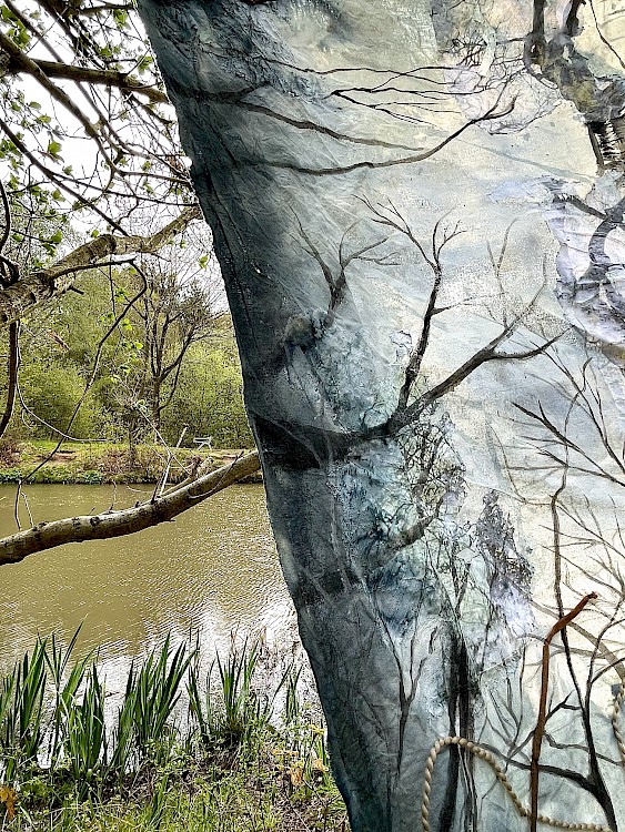 I like to paint directly onto a loose canvas material so I can paint, sew and attach images onto it. I use a transfer medium to add images onto the fabric. I sew into areas of the painting to create textures that replicate bark and foliage, to allow the participant to trigger a memory using touch.