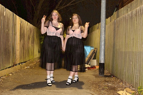 BISECT means to divide into two exactly equal parts, representing how my two bodies are equal halves of one whole. Through my practice I explore a non-normative identity as the physical manifestation of 1+1=1. Wearing matching outfits, living under one name and referring to my two bodies singularly is crucial to my practice; I am a self-proclaimed piece of Living Art. Therefore, my physical practice is an extension of my life as BISECT.