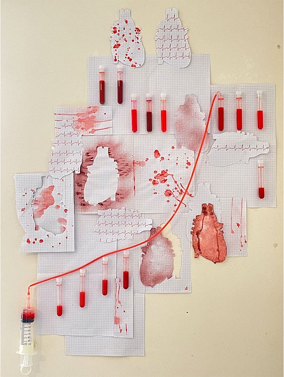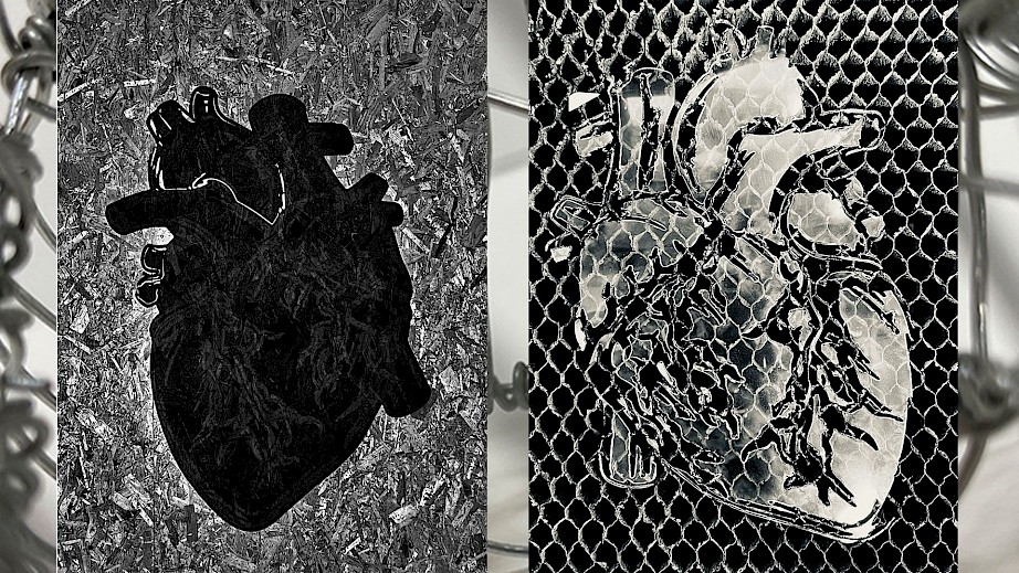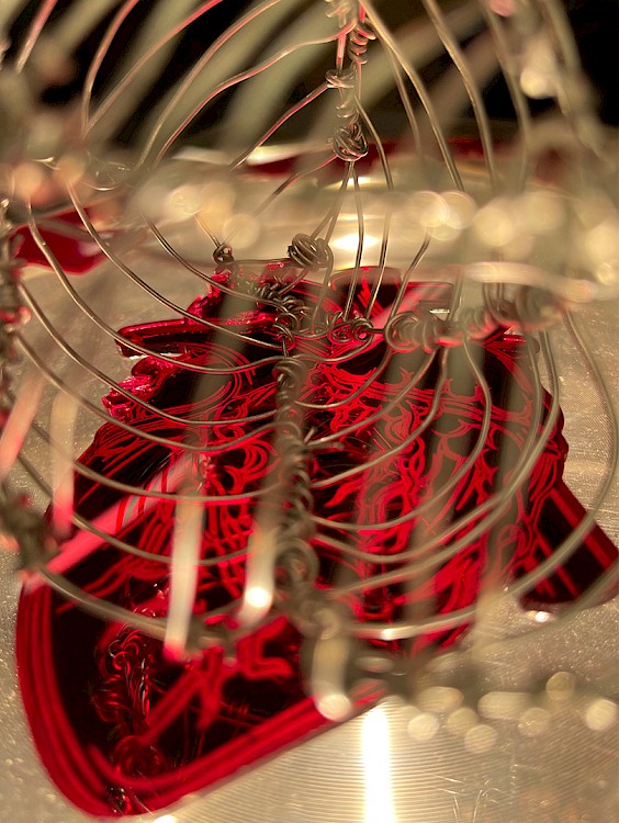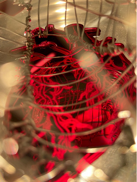 Pulse is a mixed media piece, made from laser cut and engraved acrylic and wire. Enveloped in warm lighting, it resonates the limitlessness of the otherwise caged 3D wire heart reflected within the 2D crimson, mirrored, anatomical, acrylic heart.