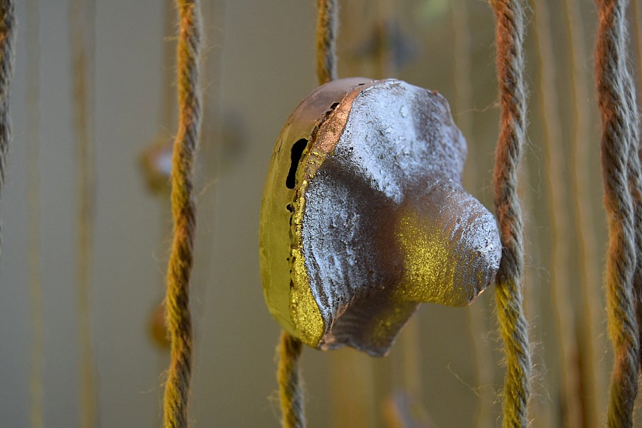 Using offcuts of my hair combined with mixed media including clay and dust, my work becomes a self-portrait. Aspects of my assemblage and installation present the beauty of curls, but I also explore coating with natural materials that connect my work to my environment and to myself. I often take a materials-based approach, enjoying the characteristics of the media, in particular the unravelled rope that recreates my hair texture on a larger scale.