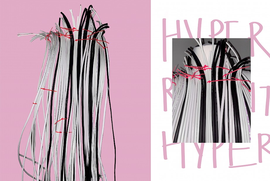 Hyper reality is the point in which reality and virtuality cross. It's a global culture where everyone can be distinguished by data, and privacy is merely a misconception. I use avant-garde techniques combined with editing to portray my interpretation of hyper reality in fashion, an industry reliant upon new technologies, particularly in such times of isolation. Throughout my investigation I've used unorthodox materials, particularly cables, to drape from the body to represent digital spaces through fashion, I contrast this with traditional sewing techniques to manipulate the materials further.